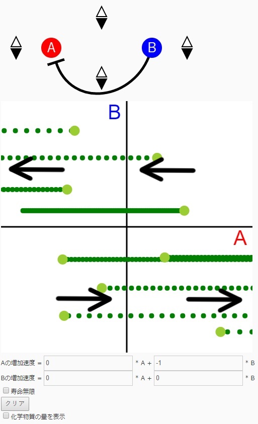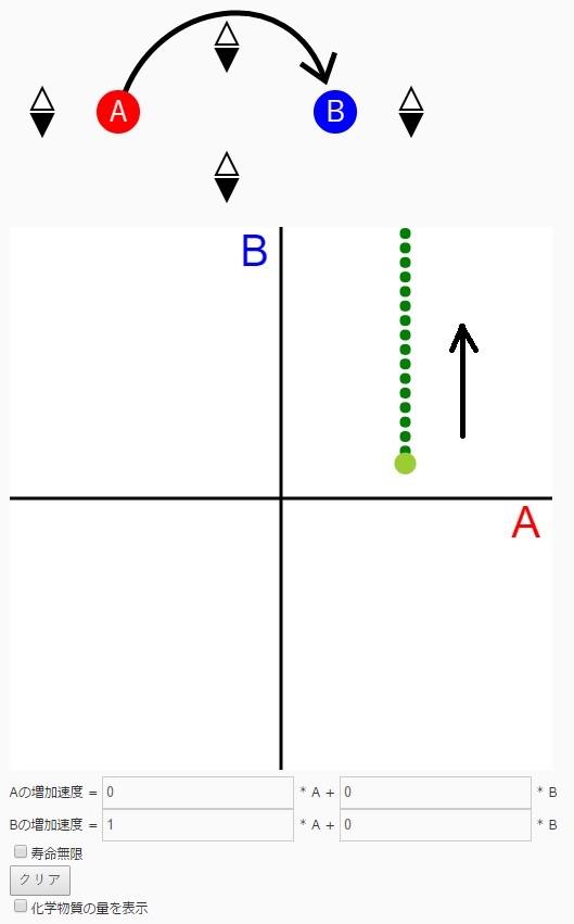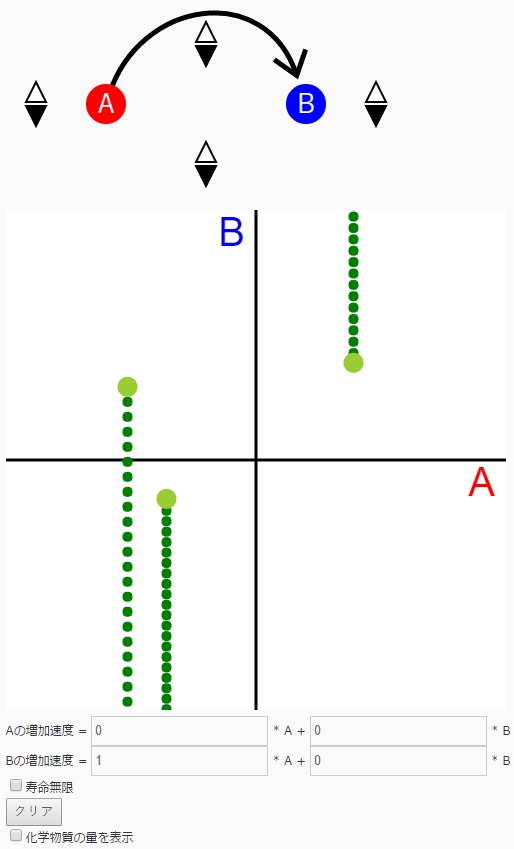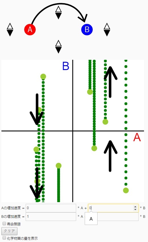 AがAを合成する反応速度定数は0.5、Bを合成する反応速度定数は1.0なので、縦が横の2倍の矢印ができます。