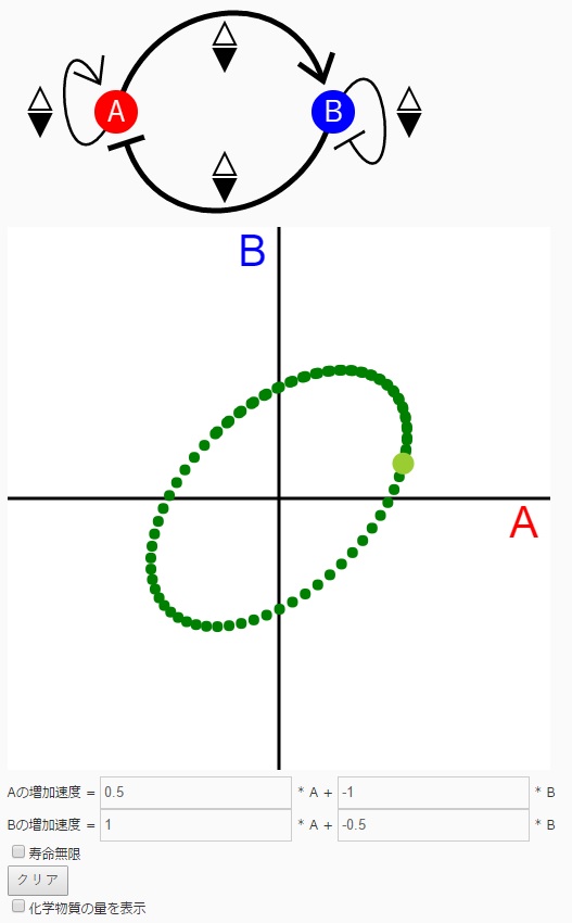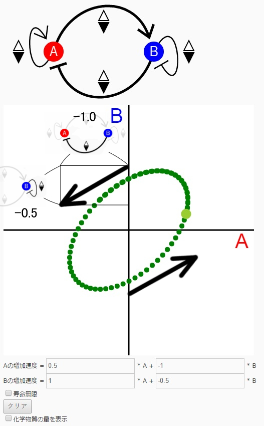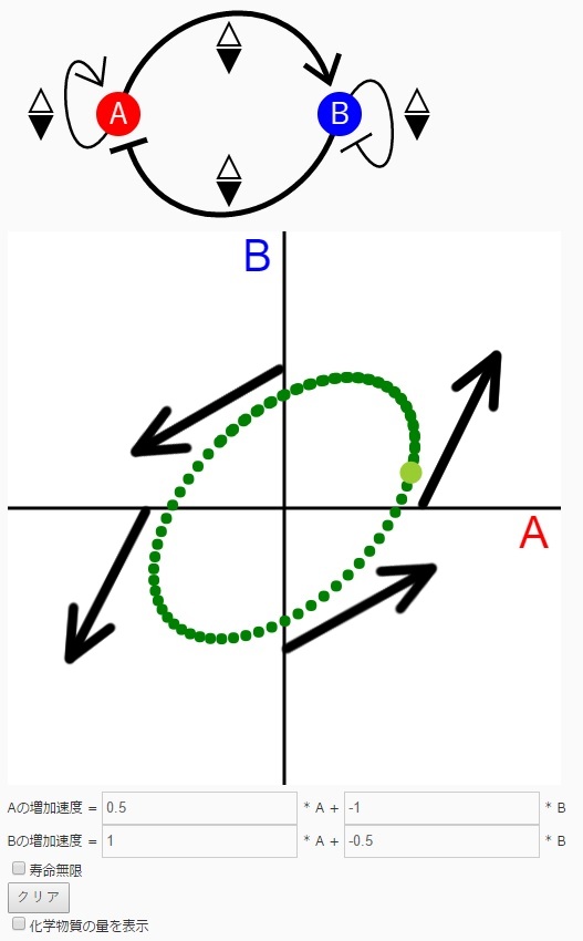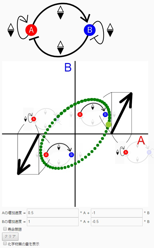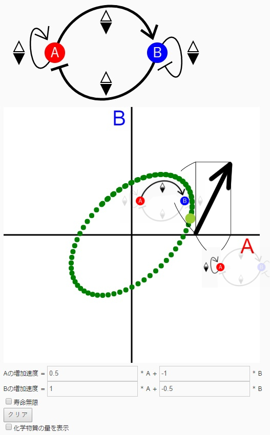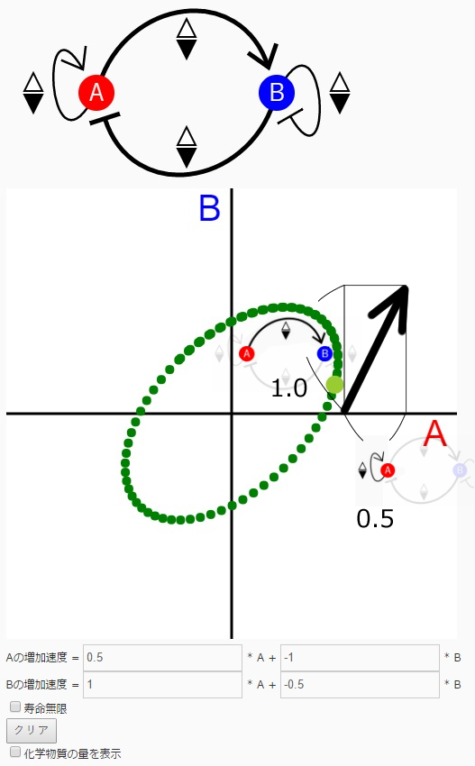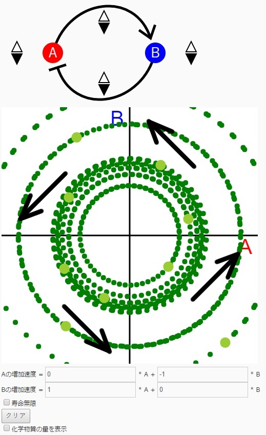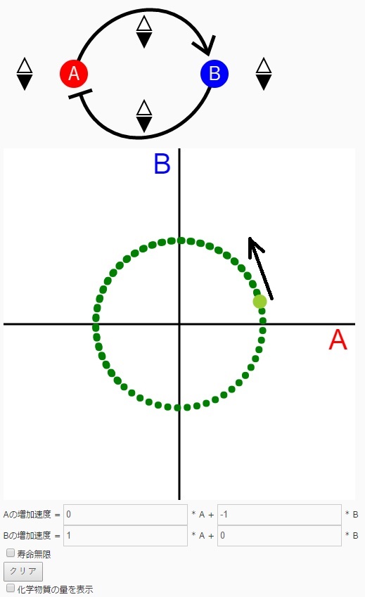 なるほど、円軌道になりました。「自分を変える反応」はどういうわけか円を楕円に変えていたようです。この理由は後で考えるとして、まずはどうしてこの反応が円を作り出すのか考えてみましょう。この反応をさらに2つに分解してみます。