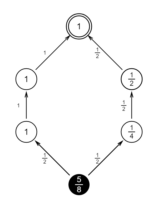 時間を遡って現在の状態に5/8を書き込みます。これは、今の状態からこの確率のとおりに世界の時間を進めていくと、タイムパラドックスを避けられる確率は5/8である、ということを意味しています。