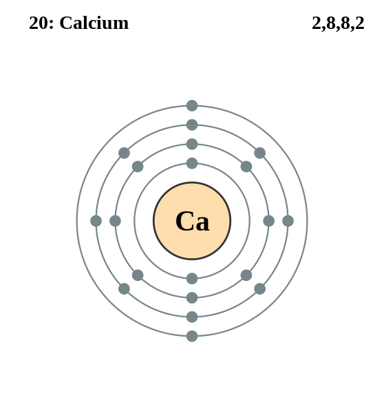 カルシウムの電子殻。Wikimedia Commonsのページより。電子はこの種の図に描かれている軌道のみ許されており、中途半端な軌道――たとえばある2つの軌道の中間の軌道――を取ることはなぜかできません。これによって電子が原子核に落ち込む軌道も許されなくなり、電子の墜落問題は解決します。