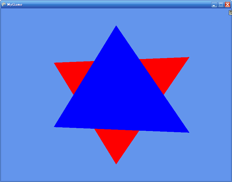 using Microsoft.Xna.Framework; using Microsoft.Xna.Framework.Graphics; class Triangle { VertexPositionColor[] vertices = new VertexPositionColor[3]; public Triangle(Vector3 p1, Vector3 p2, Vector3 p3, Color color) { vertices[0] = new VertexPositionColor(p1, color); vertices[1] = new VertexPositionColor(p2, color); vertices[2] = new VertexPositionColor(p3, color); } public void Draw(GraphicsDevice graphicsDevice, BasicEffect effect) { effect.VertexColorEnabled = true; foreach (EffectPass pass in effect.CurrentTechnique.Passes) { pass.Apply(); graphicsDevice.DrawUserPrimitives<VertexPositionColor>( PrimitiveType.TriangleList, vertices, 0, 1 ); } } } class MyGame : Game { GraphicsDeviceManager graphics; BasicEffect effect; Triangle blueTriangle = new Triangle ( new Vector3(0, 1, 0), new Vector3(1, -0.5f, 0), new Vector3(-1, -0.5f, 0), Color.Blue ); Triangle redTriangle = new Triangle ( new Vector3(1, 0.5f, -1), new Vector3(0, -1, -1), new Vector3(-1, 0.5f, -1), Color.Red ); public MyGame() { graphics = new GraphicsDeviceManager(this); } protected override void LoadContent() { effect = new BasicEffect(GraphicsDevice) { View = Matrix.CreateLookAt ( new Vector3(0, 0, 3), //カメラの位置 new Vector3(0, 0, 0), //カメラの見る点 new Vector3(0, 1, 0) //カメラの上向きベクトル ), Projection = Matrix.CreatePerspectiveFieldOfView ( MathHelper.ToRadians(45), //視野の角度。ここでは45° GraphicsDevice.Viewport.AspectRatio,//画面のアスペクト比(=横/縦) 1, //カメラからこれより近い物体は画面に映らない 100 //カメラからこれより遠い物体は画面に映らない ) }; GraphicsDevice.DepthStencilState = new DepthStencilState { DepthBufferFunction = CompareFunction.GreaterEqual }; } protected override void UnloadContent() { effect.Dispose(); } protected override void Draw(GameTime gameTime) { GraphicsDevice.Clear( ClearOptions.Target | ClearOptions.DepthBuffer, //色と深度バッファをクリア Color.CornflowerBlue, //色の初期値 0, //深度バッファの初期値(一番近いところから始める) 0 //ステンシルバッファの初期値 ); blueTriangle.Draw(GraphicsDevice, effect); redTriangle.Draw(GraphicsDevice, effect); } }