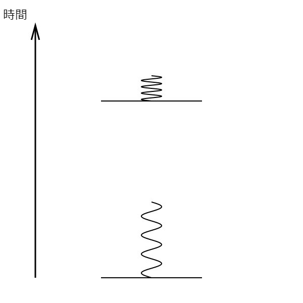 クイズです。次の図のように、バネがいきなり縮み始めました。一体どうしてでしょう?もちろん、最初バネは伸びも縮みもしていない普通の状態で、それがなぜか勝手にエネルギーが充填されるのです。