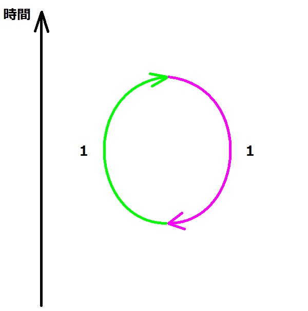 この図は、数字がタイムトラベルしてループを描いている様子を表しています。時間が逆転した空間(紫)と、時間が通常の方向を向いている空間(緑)があり、1という数字がループを描いています。これを周りの人が見たら、いきなり1という数字が2つ現れ、そして合体して消えることでしょう。これは興奮そのものです。