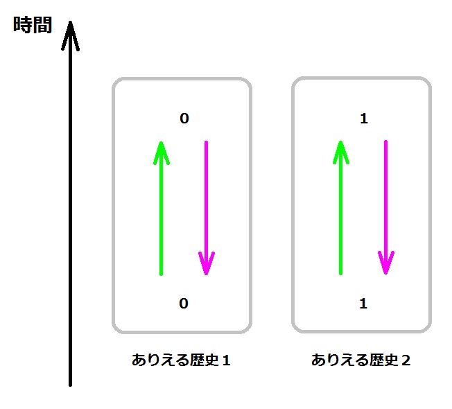 ありえるパターンは、「未来から0が送られてきたので過去に0を送る」か「未来から1が送られてきたので過去に1を送る」だけです。未来からの情報と過去に送る情報は同じなのです。「未来から0が送られてきたので過去に1を送る」はありえません。過去に1を送ったのなら、未来から1が送られてきたはずで、そうならなかったということは、何があろうと1を送ることになるのです。