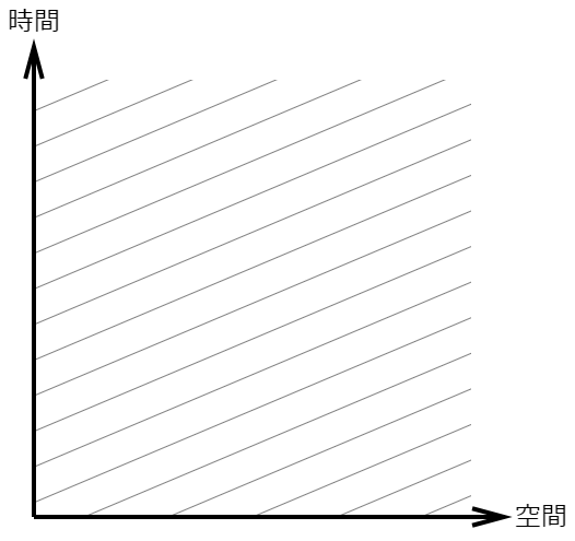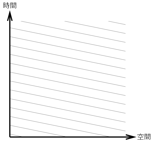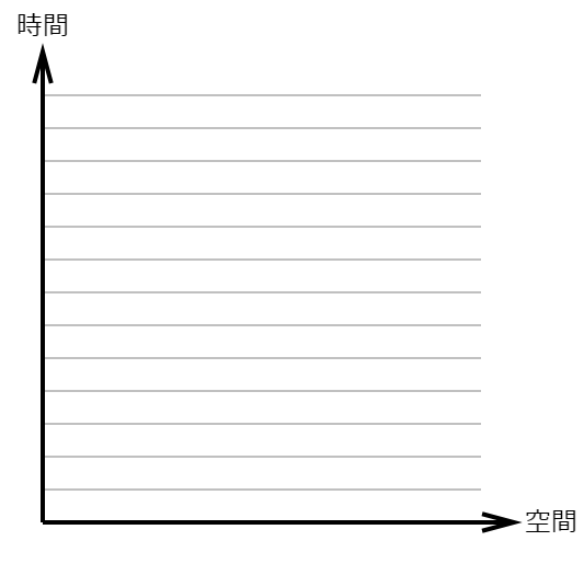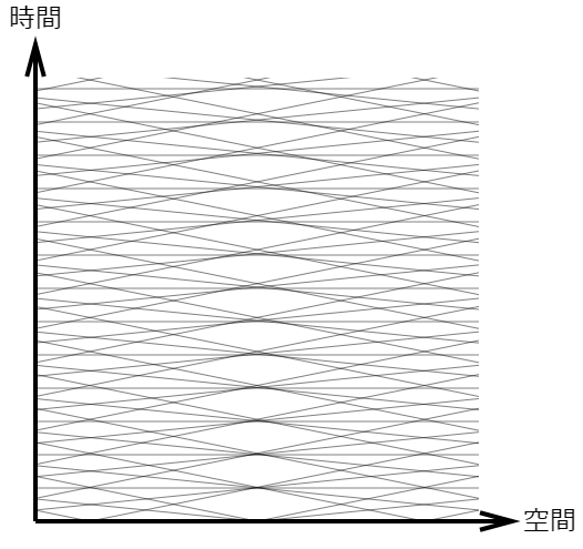 そう、それぞれの波は、回転させただけで実際は同じ波なのです!この事実は<直行>三部作の作中で「回転物理学」という名で現れています。この図を見ればシミュレーション中で波長が短い定常波ほどゆっくり振動している理由が一目瞭然ですね。空間の間隔が短くなるほど時間の間隔が長くなるというわけです。