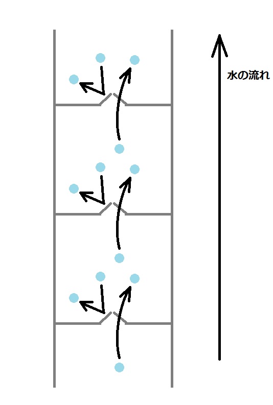 さらに、この機械をつなげて管にしてみます。そうすれば、下の貯水池から上の貯水池へエネルギーを全く使わず水を汲み上げる魔法の管を作ることが出来るでしょう。この管でストローを作って水の入ったコップに刺せば、勝手に水が上から溢れ出てくるに違いありません。
