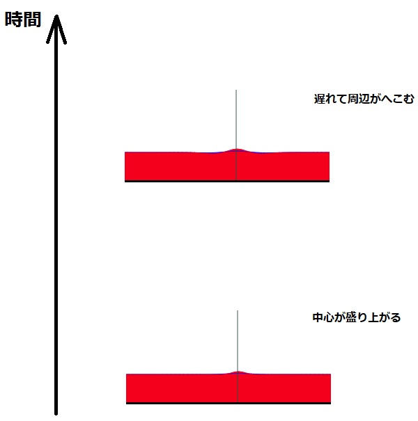 このシミュレーションを実行すると、あたかもタイムトラベルのような現象が起きるのがわかります。次の図のように、最初赤い物質が増え、つじつまを合わせるように周りの赤い物質が減るのです。まるで、赤い物質が未来から流れてきているかのようです。
