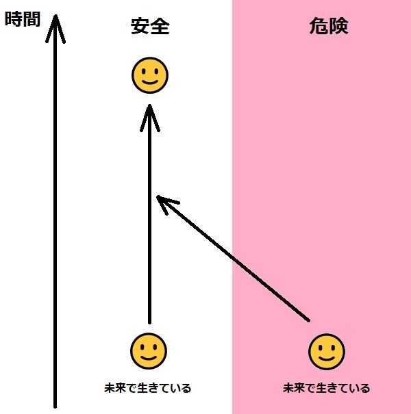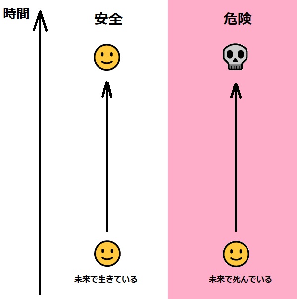 この調子で、危険な場所を、死とは関係のないものに作り変えていくことが可能です。上の例ではすぐに安全な場所に逃げましたが、道具を使って無害化することも可能でしょう。宇宙空間で人は死にますが、きちんと動作する宇宙服があれば死にません。実は宇宙服を着るというのは、宇宙空間にいるという位置情報から、「お前は未来でも生きている」という意味のメッセージを受け取るための手段だったのです!