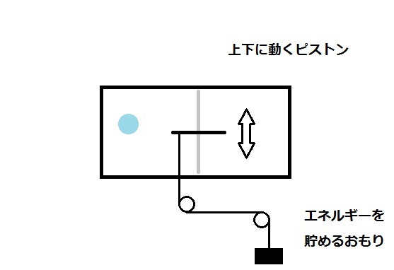 これは第二種永久機関の一種、<シラードのエンジン>のピストンを90°回転させたものです。実際の<シラードのエンジン>のピストンは左右に動きますが、この変形バージョンでは上下に動く仕掛けになってしまったとします。そうすると、気体分子が左右の部屋どちらにあるのか知っても発電には何の役にもたちません。(本来の<シラードのエンジン>は分子の位置からおもりと糸をピストンのどちら側につけるのか決めることによって、常に衝突によっておもりが上がる仕掛けになっています)