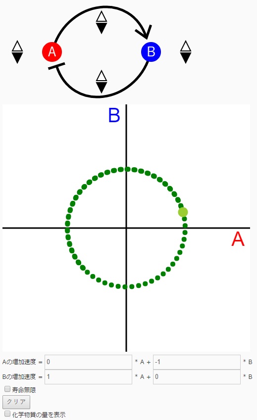 なるほど、円軌道になりました。「自分を変える反応」はどういうわけか円を楕円に変えていたようです。この理由は後で考えるとして、まずはどうしてこの反応が円を作り出すのか考えてみましょう。この反応をさらに2つに分解してみます。