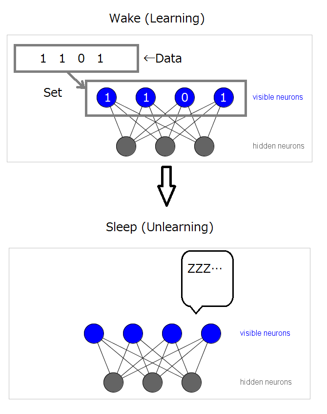 つまり実際の生き物は昼と夜にそれぞれ別に学習するのですが、コントラスティブ・ダイバージェンス法では学習をまとめてやるのですね。