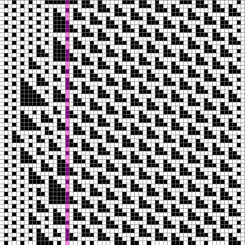 これは以前示した方法を使って、ルール110にタイムトラベル要素を追加したシミュレーションです。