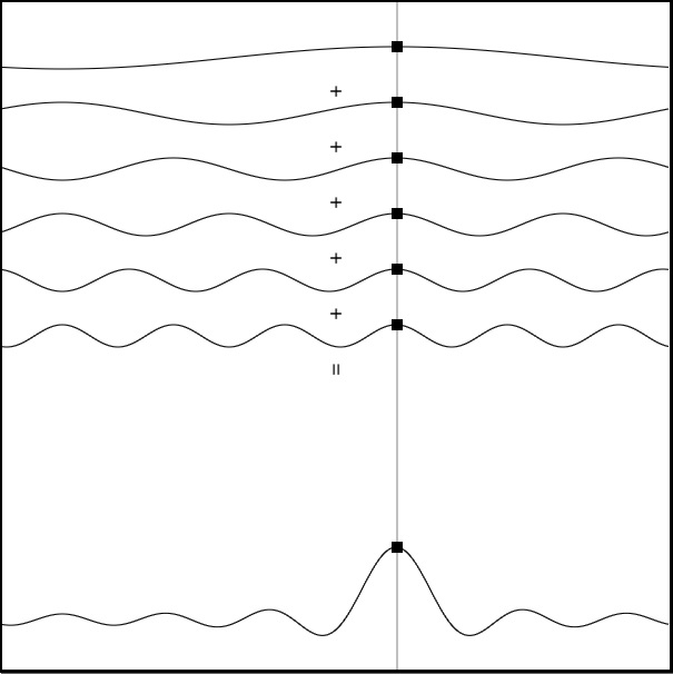 キャンバスにはいくつかの波が描かれています。上には複数の単純な波があり、下にはそれを足し合わせてできたパルスがあります。下のパルスは、一見複雑な波に見えますが、実際には上の単純な波を足し合わせたに過ぎません。これは波の足し算なのです。小学校で習う数字の足し算は単に数が大きくなるだけですが、波の足し算は形が複雑になるのです!