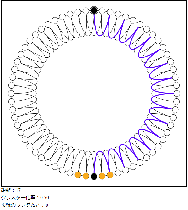 さて、ここで接続のランダムさを0.1にしてみましょう。そうすると、距離が飛躍的に減少します。