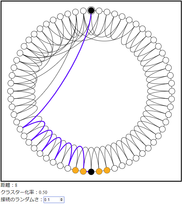 「知り合いをたどっていけばどんな人にもすぐにたどり着ける」というスモールワールドという仮説があります。「知り合いの知り合いの知り合いの…」と間に6人挟むだけで世界中の人と繋がれるのです(世界はせまい)。それを図示するデモプログラムを作りました。