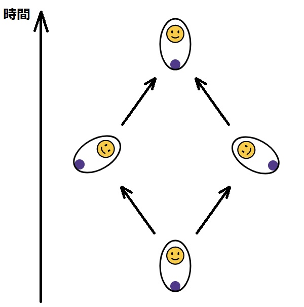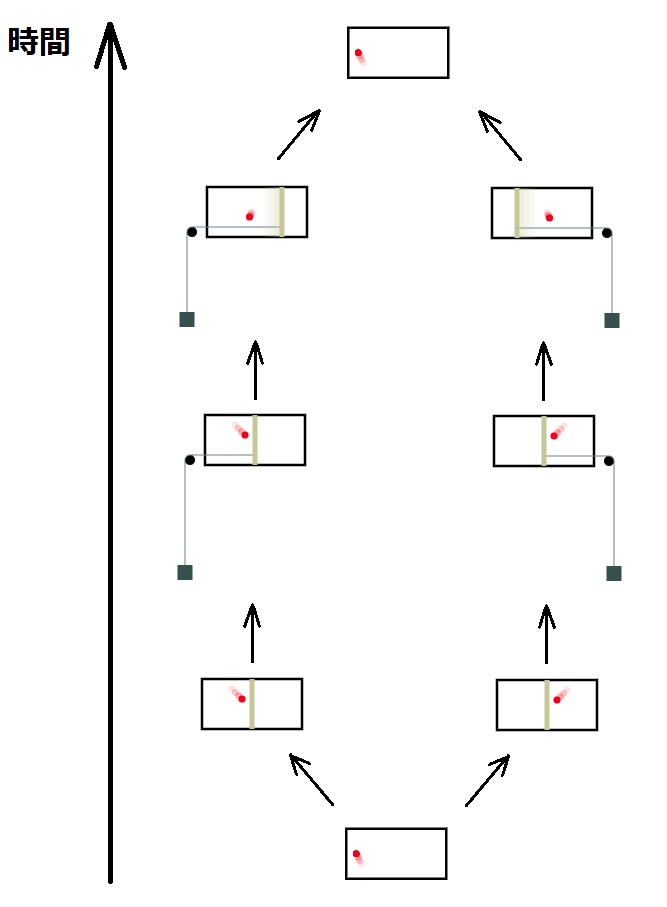 <シラードのエンジン>の可能性は分裂したままではありません。あなたは<シラードのエンジン>からエネルギーを安定供給したいので、この装置の状態を(エネルギーを蓄えたおもり以外は)すべてリセットします。最初と同じ状態にして何度も使うためです。すると面白いことに、タイムトラベルの場合と同様、「分岐して収束する」図になります。未知のものからエネルギーを得るために情報を得ると分岐しますが、装置をもう一度使うためには可能性の枝が合流しなければならないのです。ちなみに、この合流こそが<シラードのエンジン>が本物の永久機関でない理由です。この宇宙では物理法則により、可能性が合流したときにエネルギーを失うことが宿命付けられており、その量はおもりに蓄えたエネルギーより大きいのです。<シラードのエンジン>をじっさいに作ったとしても、それは外部からのエネルギーを無駄に消費するガラクタでしかありません。