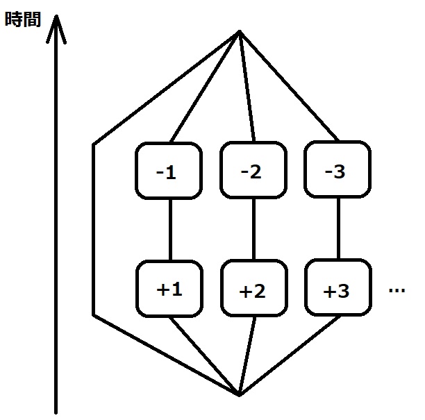 タイムマシンによって未来から情報が送られてきたとします。すると、あなたはその情報を必ず過去へ送らなければいけなくなります。そして、その2つの情報は完全に等しいのです。もしあなたが未来からやってきた数字に+1してしまったとしたら、そのあとかならず-1しなくてはいけません。どんな変更を加えても、その変更は必ず後で打ち消さなければいけないのです。未来からの情報のたどる可能性を図にすると、次のように広がってもとに戻ります。