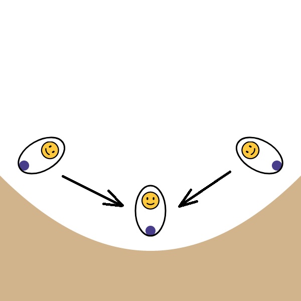 わたしがおきあがりこぼしに注目しているのは、これもやはり「分岐して収束する」からです。あかちゃんがおきあがりこぼしを傾ける方法はたくさんあり、それによって状態は分裂しますが、おきあがりこぼしの機能により元の姿勢に戻るのです。