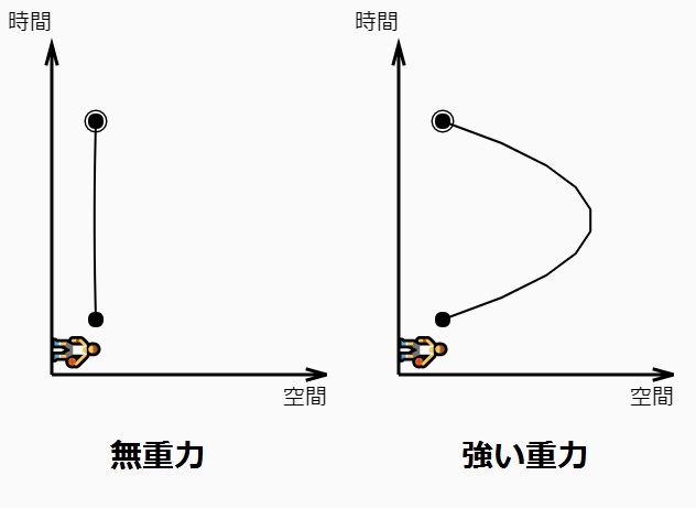 無重力状態でキャッチボールをする時と、地上でする時は投げるべき方向が違います。地上では、少し上に向かって投げなければいけません。