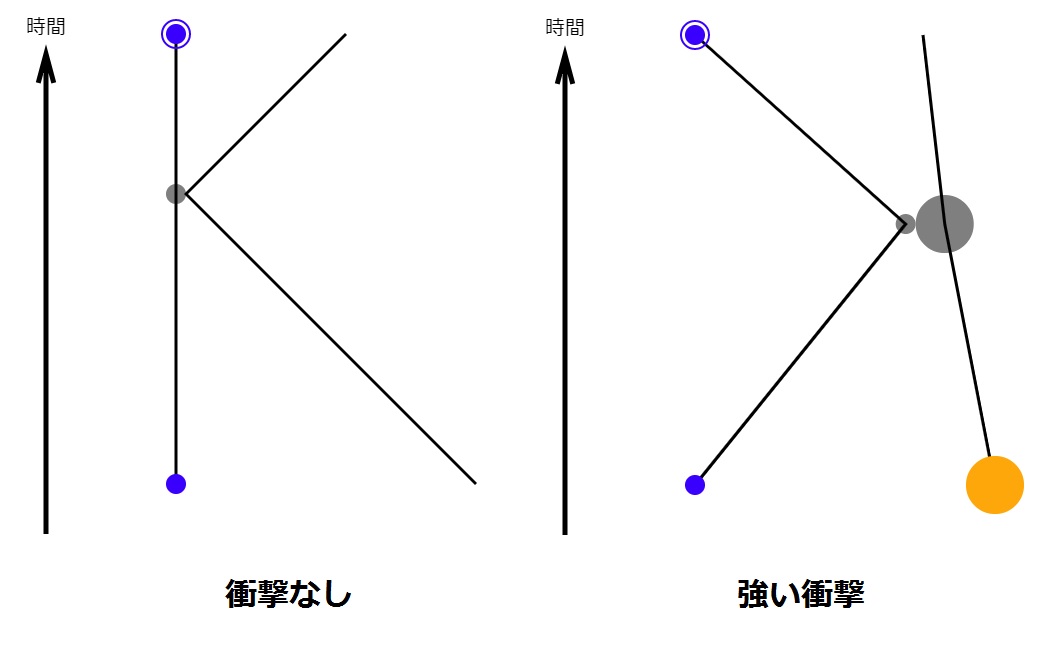 ちなみに、この例を変形することで重力で落ちるボールの動きを再現できます。眼に見えないほど小さなボールを、速度を慎重に調節しながら連続的に青ボールにぶつけ続ければよいのです。そうすれば青ボールは少しずつ軌道が変わっていき、カーブを描くでしょう。