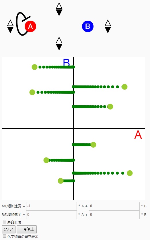 まるでB軸が緑玉(化学的な状態)を吸い込む能力を持っているかのようです。これを固定点アトラクタといいます。アトラクトとは「引き付ける」という意味です。緑玉はA=0という固定点に吸い込まれていきます。