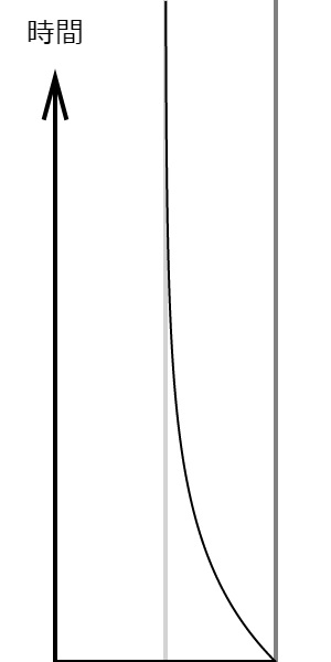 粒子が十分にたくさんの数があれば(つまり、私達の日常の感覚では)、ランダムなゆらぎは(ほぼ)無いことに注意して下さい。私達が日常で目にする拡散現象は、次の図のようになります。