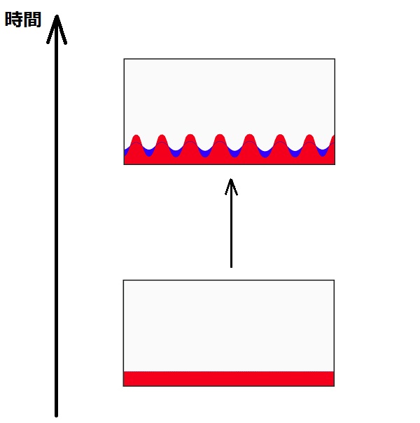 もちろん絵の具のこの例とチューリング・パターンには違いもあります。チューリング・パターンは一か所に物質が集中するのではなく、均等な間隔で濃度の山が生まれます。しかしそれは時間逆転でもあり得る話です。もしバケツに均等な間隔で絵の具を垂らしたら、やはり拡散してバケツの水はどこも同じ色になるでしょう。