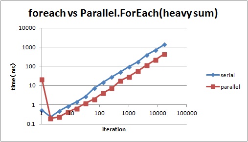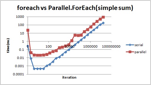 using System; using System.Linq; using System.Diagnostics; using System.Threading.Tasks; class Program { const int iteration = 1000; const int numbers2Count = 10000; static void Main(string[] args) { var numbers = Enumerable.Range(0, iteration); Stopwatch stopwatch = new Stopwatch(); stopwatch.Start(); var sum = serialSum(numbers); //var sum = parallelSum(numbers); stopwatch.Stop(); Console.WriteLine("sum : " + sum); Console.WriteLine(stopwatch.Elapsed.TotalMilliseconds + "ms"); Console.ReadLine(); } private static ulong serialSum(System.Collections.Generic.IEnumerable<int> numbers) { ulong sum = 0; foreach (var number in numbers) { var numbers2 = Enumerable.Range(0, numbers2Count); sum += (ulong)numbers2.Sum(); } return sum; } private static ulong parallelSum(System.Collections.Generic.IEnumerable<int> numbers) { ulong sum = 0; Parallel.ForEach( numbers, () => (ulong)0, (number, state, threadLocalSum) => { return threadLocalSum + (ulong)Enumerable.Range(0, numbers2Count).Sum(); }, threadLocalSum => { lock (numbers) { sum += threadLocalSum; } }); return sum; } }serialSum() : 83.5064ms