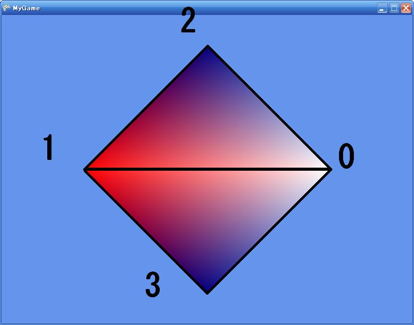 using Microsoft.Xna.Framework; using Microsoft.Xna.Framework.Graphics; class MyGame : Game { GraphicsDeviceManager graphics; BasicEffect effect; VertexPositionColor[] vertices = new[] { new VertexPositionColor(new Vector3(1, 0, 0), Color.White), new VertexPositionColor(new Vector3(-1, 0, 0), Color.Red), new VertexPositionColor(new Vector3(0, 1, 0), Color.Blue), new VertexPositionColor(new Vector3(0, -1, 0), Color.Blue), }; VertexBuffer vertexBuffer; int[] indices = new[] { 0, 1, 2, 0, 3, 1 }; IndexBuffer indexBuffer; public MyGame() { graphics = new GraphicsDeviceManager(this); } protected override void LoadContent() { effect = new BasicEffect(GraphicsDevice) { VertexColorEnabled = true, View = Matrix.CreateLookAt ( new Vector3(0, 0, 3), //カメラの位置 new Vector3(0, 0, 0), //カメラの見る点 new Vector3(0, 1, 0) //カメラの上向きベクトル ), Projection = Matrix.CreatePerspectiveFieldOfView ( MathHelper.ToRadians(45), //視野の角度。ここでは45° GraphicsDevice.Viewport.AspectRatio,//画面のアスペクト比(=横/縦) 1, //カメラからこれより近い物体は画面に映らない 100 //カメラからこれより遠い物体は画面に映らない ) }; vertexBuffer = new VertexBuffer( GraphicsDevice, typeof(VertexPositionColor), vertices.Length, BufferUsage.None ); vertexBuffer.SetData<VertexPositionColor>(vertices); indexBuffer = new IndexBuffer( GraphicsDevice, IndexElementSize.ThirtyTwoBits, indices.Length, BufferUsage.None ); indexBuffer.SetData<int>(indices); } protected override void UnloadContent() { effect.Dispose(); vertexBuffer.Dispose(); indexBuffer.Dispose(); } protected override void Draw(GameTime gameTime) { GraphicsDevice.Clear(Color.CornflowerBlue); foreach (var pass in effect.CurrentTechnique.Passes) { pass.Apply(); GraphicsDevice.SetVertexBuffer(vertexBuffer); GraphicsDevice.Indices = indexBuffer; GraphicsDevice.DrawIndexedPrimitives( PrimitiveType.TriangleList, 0, //baseIndex 0, //minVertexIndex vertices.Length, //numVertices 0, //startIndex indices.Length / 3 //primitiveCount ); } } }