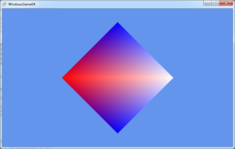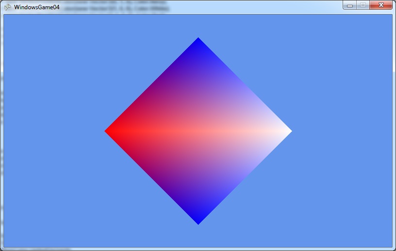 using Microsoft.Xna.Framework; using Microsoft.Xna.Framework.Graphics; class MyGame : Game { GraphicsDeviceManager graphics; BasicEffect effect; VertexPositionColor[] vertices = new[] { new VertexPositionColor(new Vector3(1, 0, 0), Color.White), new VertexPositionColor(new Vector3(-1, 0, 0), Color.Red), new VertexPositionColor(new Vector3(0, 1, 0), Color.Blue), new VertexPositionColor(new Vector3(0, -1, 0), Color.Blue), }; int[] indices = new[] { 0, 1, 2, 0, 3, 1 }; public MyGame() { graphics = new GraphicsDeviceManager(this); } protected override void LoadContent() { effect = new BasicEffect(GraphicsDevice) { VertexColorEnabled = true, View = Matrix.CreateLookAt ( new Vector3(0, 0, 3), //カメラの位置 new Vector3(0, 0, 0), //カメラの見る点 new Vector3(0, 1, 0) //カメラの上向きベクトル ), Projection = Matrix.CreatePerspectiveFieldOfView ( MathHelper.ToRadians(45), //視野の角度。ここでは45° GraphicsDevice.Viewport.AspectRatio,//画面のアスペクト比(=横/縦) 1, //カメラからこれより近い物体は画面に映らない 100 //カメラからこれより遠い物体は画面に映らない ) }; } protected override void UnloadContent() { effect.Dispose(); } protected override void Draw(GameTime gameTime) { GraphicsDevice.Clear(Color.CornflowerBlue); foreach (var pass in effect.CurrentTechnique.Passes) { pass.Apply(); GraphicsDevice.DrawUserIndexedPrimitives<VertexPositionColor>( PrimitiveType.TriangleList, vertices, 0, vertices.Length, indices, 0, indices.Length / 3 ); } } }