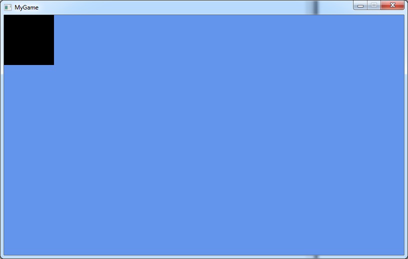 using Microsoft.Xna.Framework; using Microsoft.Xna.Framework.Graphics; class MyGame : Game { GraphicsDeviceManager graphics; SpriteBatch spriteBatch; Texture2D texture; public MyGame() { graphics = new GraphicsDeviceManager(this); } protected override void LoadContent() { spriteBatch = new SpriteBatch(GraphicsDevice); texture = new Texture2D(GraphicsDevice, 1, 1); texture.SetData<Color>(new Color[] { Color.Black }); } protected override void Draw(GameTime gameTime) { GraphicsDevice.Clear(Color.CornflowerBlue); spriteBatch.Begin(); spriteBatch.Draw(texture, new Rectangle(0, 0, 100, 100), Color.White); spriteBatch.End(); } static void Main() { using (MyGame game = new MyGame()) { game.Run(); } } }