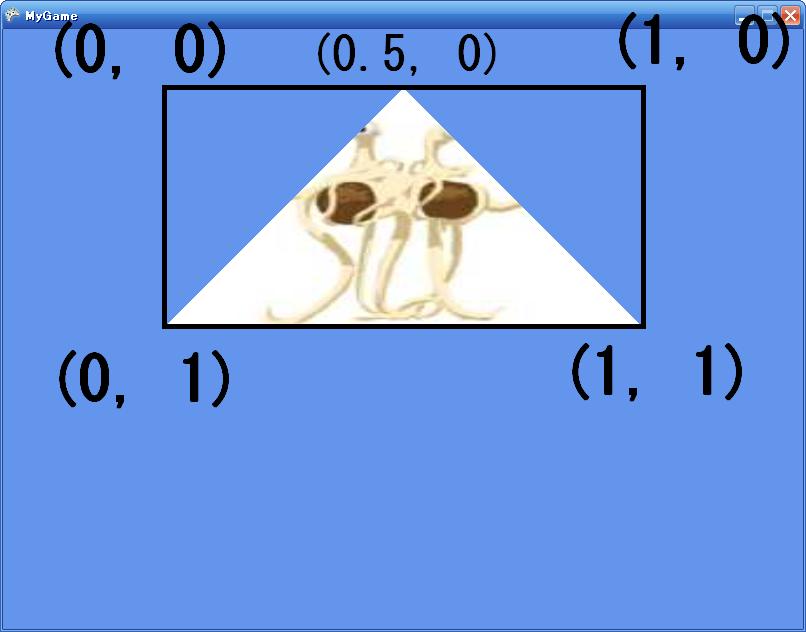 3つのそれぞれの頂点は、座標と、画像のどの部分を担当するかのデータを持っています。