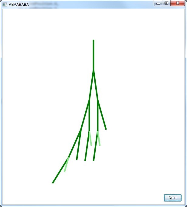 using System.Windows; using System.Windows.Media; using System.Windows.Shapes; namespace LSystem.Algae { public partial class MainWindow : Window { Algae algae = new Algae(); public MainWindow() { InitializeComponent(); } private void Button_Click(object sender, RoutedEventArgs e) { algae.Develop(); Title = getText(algae.Root); canvas.Children.Clear(); draw(algae.Root, new Vector(300, 100), 0); } private string getText(AlgaeCell cell) { var text = ""; algae.ForEachTerminal((c) => text += c.IsBig ? "A" : "B"); return text; } private void draw(AlgaeCell cell, Vector position, double angle) { var transform = new TransformGroup(); transform.Children.Add( new ScaleTransform(cell.IsBig ? 1 : 0.5, cell.IsBig ? 1 : 0.5) ); transform.Children.Add(new RotateTransform(angle)); var endPosition = position + transform.Value.Transform(new Vector(0, 100)); var line = new Line { X1 = position.X, Y1 = position.Y, X2 = endPosition.X, Y2 = endPosition.Y, Stroke = cell.IsBig ? Brushes.Green : Brushes.LightGreen, StrokeThickness = 5 }; canvas.Children.Add(line); if (cell.HasChildren) { draw( cell.Child1, endPosition, angle + 8 ); draw( cell.Child2, endPosition, angle - 8 ); } } } }