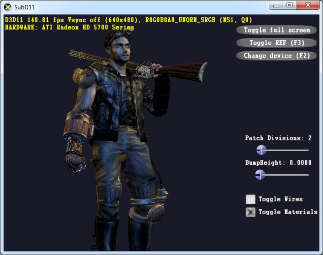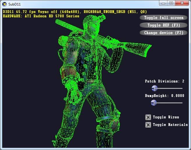 using SlimDX.Direct3D11;using SlimDX.DXGI;using SlimDX.D3DCompiler;class Program{static void Main(){using (Game game = new MyGame()){game.Run();}}}class MyGame : Game{Effect effect;InputLayout vertexLayout;Buffer vertexBuffer;protected override void Draw(){GraphicsDevice.ImmediateContext.ClearRenderTargetView(RenderTarget,new SlimDX.Color4(1, 0, 0, 1));initTriangleInputAssembler();drawTriangle();SwapChain.Present(0, PresentFlags.None);}private void drawTriangle(){effect.GetTechniqueByIndex(0).GetPassByIndex(0).Apply(GraphicsDevice.ImmediateContext);GraphicsDevice.ImmediateContext.Draw(3, 0);}private void initTriangleInputAssembler(){GraphicsDevice.ImmediateContext.InputAssembler.InputLayout = vertexLayout;GraphicsDevice.ImmediateContext.InputAssembler.SetVertexBuffers(0,new VertexBufferBinding(vertexBuffer, sizeof(float) * 3, 0));GraphicsDevice.ImmediateContext.InputAssembler.PrimitiveTopology= PrimitiveTopology.TriangleList;}protected override void LoadContent(){initEffect();initVertexLayout();initVertexBuffer();initWireframeRasterizerState();}private void initEffect(){using (ShaderBytecode shaderBytecode = ShaderBytecode.CompileFromFile("myEffect.fx", "fx_5_0",ShaderFlags.None,EffectFlags.None)){effect = new Effect(GraphicsDevice, shaderBytecode);}}private void initVertexLayout(){vertexLayout = new InputLayout(GraphicsDevice,effect.GetTechniqueByIndex(0).GetPassByIndex(0).Description.Signature,new[] {new InputElement{SemanticName = "SV_Position",Format = Format.R32G32B32_Float}});}private void initVertexBuffer(){vertexBuffer = MyDirectXHelper.CreateVertexBuffer(GraphicsDevice,new[] {new SlimDX.Vector3(0, 0.5f, 0),new SlimDX.Vector3(0.5f, 0, 0),new SlimDX.Vector3(-0.5f, 0, 0),});}private void initWireframeRasterizerState(){var desc = new RasterizerStateDescription{CullMode = CullMode.Back,FillMode = FillMode.Wireframe,};GraphicsDevice.ImmediateContext.Rasterizer.State= RasterizerState.FromDescription(GraphicsDevice,desc);}protected override void UnloadContent(){GraphicsDevice.ImmediateContext.Rasterizer.State.Dispose();effect.Dispose();vertexLayout.Dispose();vertexBuffer.Dispose();}}class Game : System.Windows.Forms.Form{public SlimDX.Direct3D11.Device GraphicsDevice;public SwapChain SwapChain;public RenderTargetView RenderTarget;public void Run(){initDevice();SlimDX.Windows.MessagePump.Run(this, Draw);disposeDevice();}private void initDevice(){MyDirectXHelper.CreateDeviceAndSwapChain(this, out GraphicsDevice, out SwapChain);initRenderTarget();initViewport();LoadContent();}private void initRenderTarget(){using (Texture2D backBuffer= SlimDX.Direct3D11.Resource.FromSwapChain<Texture2D>(SwapChain, 0)){RenderTarget = new RenderTargetView(GraphicsDevice, backBuffer);GraphicsDevice.ImmediateContext.OutputMerger.SetTargets(RenderTarget);}}private void initViewport(){GraphicsDevice.ImmediateContext.Rasterizer.SetViewports(new Viewport{Width = ClientSize.Width,Height = ClientSize.Height,});}private void disposeDevice(){UnloadContent();RenderTarget.Dispose();GraphicsDevice.Dispose();SwapChain.Dispose();}protected virtual void Draw() { }protected virtual void LoadContent() { }protected virtual void UnloadContent() { }}class MyDirectXHelper{public static void CreateDeviceAndSwapChain(System.Windows.Forms.Form form,out SlimDX.Direct3D11.Device device,out SlimDX.DXGI.SwapChain swapChain){SlimDX.Direct3D11.Device.CreateWithSwapChain(DriverType.Hardware,DeviceCreationFlags.None,new SwapChainDescription{BufferCount = 1,OutputHandle = form.Handle,IsWindowed = true,SampleDescription = new SampleDescription{Count = 1,Quality = 0},ModeDescription = new ModeDescription{Width = form.ClientSize.Width,Height = form.ClientSize.Height,RefreshRate = new SlimDX.Rational(60, 1),Format = Format.R8G8B8A8_UNorm},Usage = Usage.RenderTargetOutput},out device,out swapChain);}public static Buffer CreateVertexBuffer(SlimDX.Direct3D11.Device graphicsDevice,System.Array vertices){using (SlimDX.DataStream vertexStream= new SlimDX.DataStream(vertices, true, true)){return new Buffer(graphicsDevice,vertexStream,new BufferDescription{SizeInBytes= (int)vertexStream.Length,BindFlags = BindFlags.VertexBuffer,});}}}