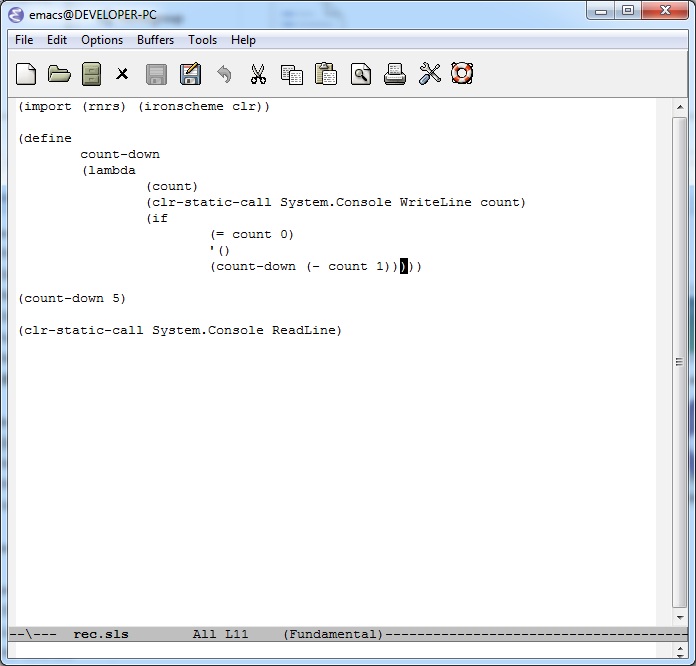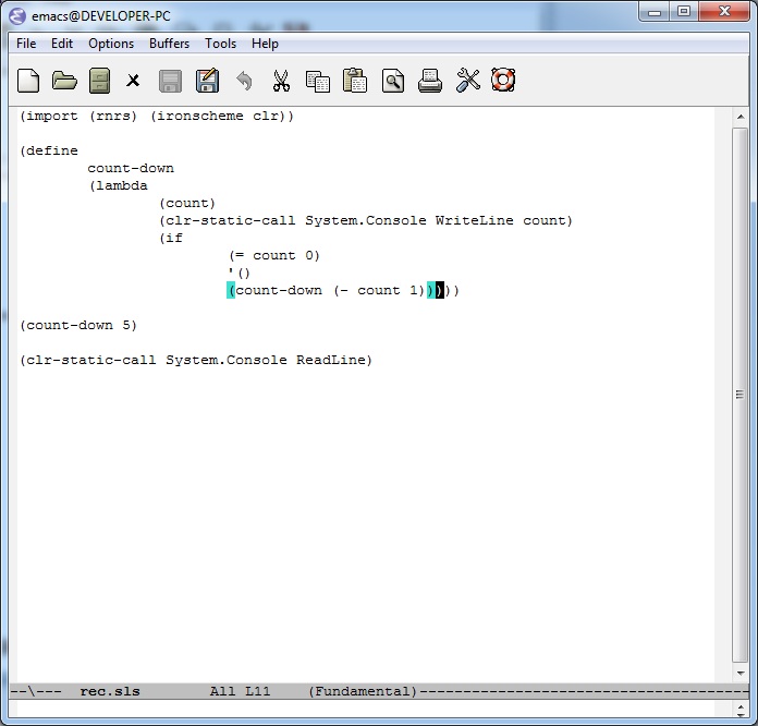 (show-paren-mode t) ;思わず"\"C:\\Program Files\\IronScheme\\IronScheme.Console\" -emacs" ;としたくなってしまうかもしれませんが、それでは何故かうまくいきません。 ;%ProgramFiles%を使ってもダメです。 ;きちんと"C:\Program Files\IronScheme"にパスを通して、以下のようにしてください。 ;run-schemeの実装に原因があるかもしれません(※)。 ;※参考:http://saito.s4.xrea.com/wiliki.cgi?Emacs%3Ascheme-args-to-list (setq scheme-program-name "IronScheme.Console.exe -emacs") (run-scheme scheme-program-name) ;エラーの文字化け対策 (modify-coding-system-alist 'process "IronScheme.Console" '(utf-8 . utf-8))