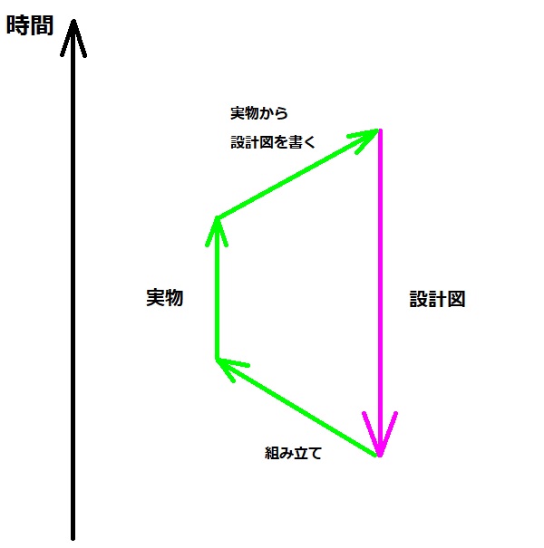 未知の装置の設計図を未来から送ってもらい、それをまた過去に送るということをやる場合、情報は次のようなループを描きます。あなたは未来からやってきた設計図に基づき装置を組み立て、その装置の写真を撮り、製作例として設計図にのせるのです。