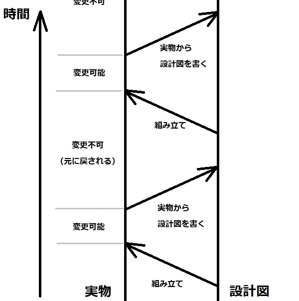 重要なのは、ここでは物質がループを描いているのではなく、情報がループを描いているという点です。だから設計図が途中で実物になって、実物が設計図になるという変化が許されるのです。これはちょうど、数字がループを描いている時、途中で+1になっても、後で-1になれば許されるというのと同じです(設計図→実物の変化が+1で、実物→設計図の変化が-1だと考えて下さい)。途中で変化していても、一周回ったときに元の状態に戻っていれば、タイムパラドックスは起きないのです。