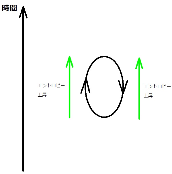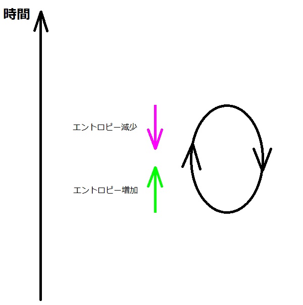 しかし、これは当然だといえます。ループとは元に戻るものであり、上がったエントロピーは下がる必要があります。今、ループの半分は時間を逆行しているので、エントロピーが下がる代わりに上がるわけです。インチキのようですが、つじつまはあっています。