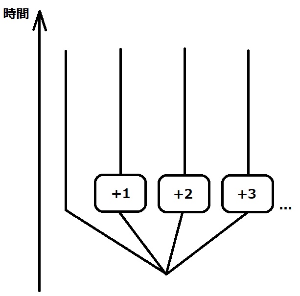 もうちょっとかんたんな例――タイムトラベルする数字――で考えると次の図のようになります。未来から数字が来た後、そこにどんな変化が加わるかわからないので、可能性は広がります。しかしその後、可能性は一つに戻るのです。
