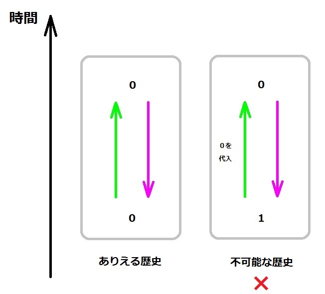 この図では2ビットの情報(0か1か2か3)をタイムマシンでループさせています。このとき、1~3の情報は別の数字に書き換えているため、生き残るのは0を未来から受け取る歴史だけです。歴史が消滅するのは、データを勝手に変更したからであって、変更した後どんな数字になっているかは歴史の消滅と関係ないのです。