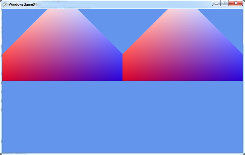 using Microsoft.Xna.Framework; using Microsoft.Xna.Framework.Graphics; class MyGame : Game { GraphicsDeviceManager graphics; BasicEffect basicEffect; VertexPositionColor[] vertices = { new VertexPositionColor(new Vector3(0, 1, 0), Color.White), new VertexPositionColor(new Vector3(1, 0, 0), Color.Blue), new VertexPositionColor(new Vector3(-1, 0, 0), Color.Red) }; public MyGame() { graphics = new GraphicsDeviceManager(this); } protected override void LoadContent() { basicEffect = new BasicEffect(GraphicsDevice) { VertexColorEnabled = true, View = Matrix.CreateLookAt ( new Vector3(0, 0, 2), //カメラの位置 new Vector3(0, 0, 0), //カメラの見る点 new Vector3(0, 1, 0) //カメラの上向きベクトル ), Projection = Matrix.CreatePerspectiveFieldOfView ( MathHelper.ToRadians(45), //視野の角度。ここでは45° GraphicsDevice.Viewport.AspectRatio / 2,//画面のアスペクト比(=横/縦) 1, //カメラからこれより近い物体は画面に映らない 100 //カメラからこれより遠い物体は画面に映らない ) }; } protected override void UnloadContent() { basicEffect.Dispose(); } protected override void Draw(GameTime gameTime) { GraphicsDevice.Clear(Color.CornflowerBlue); Viewport fullViewport = graphics.GraphicsDevice.Viewport; Viewport leftViewport = fullViewport; leftViewport.Width /= 2; graphics.GraphicsDevice.Viewport = leftViewport; drawTriangle(); Viewport rightViewport = leftViewport; rightViewport.X = leftViewport.Width; graphics.GraphicsDevice.Viewport = rightViewport; drawTriangle(); graphics.GraphicsDevice.Viewport = fullViewport; } private void drawTriangle() { foreach (EffectPass pass in basicEffect.CurrentTechnique.Passes) { pass.Apply(); GraphicsDevice.DrawUserPrimitives<VertexPositionColor>( PrimitiveType.TriangleList, vertices, 0, vertices.Length / 3 ); } } }