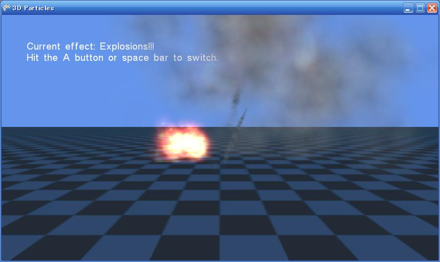 using Microsoft.Xna.Framework; using Microsoft.Xna.Framework.Graphics; class MyGame : Game { GraphicsDeviceManager graphics; BasicEffect effect; VertexPositionTexture[] vertices; Texture2D texture; public MyGame() { graphics = new GraphicsDeviceManager(this); const int particleCount = 20; vertices = new VertexPositionTexture[particleCount * 6]; for (int i = 0; i < particleCount; i++) { vertices[i * 6 + 0] = new VertexPositionTexture(new Vector3(-1, 1, 0), new Vector2(0, 0)); vertices[i * 6 + 1] = new VertexPositionTexture(new Vector3(1, 1, 0), new Vector2(1, 0)); vertices[i * 6 + 2] = new VertexPositionTexture(new Vector3(1, -1, 0), new Vector2(1, 1)); vertices[i * 6 + 3] = new VertexPositionTexture(new Vector3(-1, 1, 0), new Vector2(0, 0)); vertices[i * 6 + 4] = new VertexPositionTexture(new Vector3(1, -1, 0), new Vector2(1, 1)); vertices[i * 6 + 5] = new VertexPositionTexture(new Vector3(-1, -1, 0), new Vector2(0, 1)); for (int j = 0; j < 6; j++) { vertices[i * 6 + j].Position *= 0.5f; vertices[i * 6 + j].Position += new Vector3( (float)System.Math.Cos(2 * System.Math.PI * i / particleCount), 0, (float)System.Math.Sin(2 * System.Math.PI * i / particleCount) ); } } } protected override void LoadContent() { effect = new BasicEffect(GraphicsDevice) { TextureEnabled = true, View = Matrix.CreateLookAt ( new Vector3(0, 3, 3), //カメラの位置 new Vector3(0, 0, 0), //カメラの見る点 new Vector3(0, 1, 0) //カメラの上向きベクトル ), Projection = Matrix.CreatePerspectiveFieldOfView ( MathHelper.ToRadians(45), //視野の角度。ここでは45° GraphicsDevice.Viewport.AspectRatio,//画面のアスペクト比(=横/縦) 1, //カメラからこれより近い物体は画面に映らない 100 //カメラからこれより遠い物体は画面に映らない ) }; texture = Content.Load<Texture2D>("Content/explosion"); } protected override void UnloadContent() { effect.Dispose(); } protected override void Draw(GameTime gameTime) { GraphicsDevice.Clear(Color.CornflowerBlue); GraphicsDevice.BlendState = BlendState.Additive; GraphicsDevice.DepthStencilState = DepthStencilState.None; effect.Texture = texture; foreach (var pass in effect.CurrentTechnique.Passes) { pass.Apply(); GraphicsDevice.DrawUserPrimitives<VertexPositionTexture>( PrimitiveType.TriangleList, vertices, 0, vertices.Length / 3 ); } } }